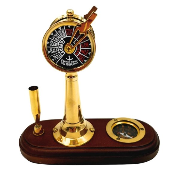 Zestaw na biurko na drewnianej podstawie to propozycja dla osób ceniących marynistyczny styl i klasyczny design. Wykonany z drewna i mosiądzu, przyciąga uwagę detalami i wysoką jakością wykończenia. Łączy w sobie trzy elementy w stylu retro i marynistycznym: miniaturowy telegraf maszynowy, kompas i praktyczny uchwyt na długopis.