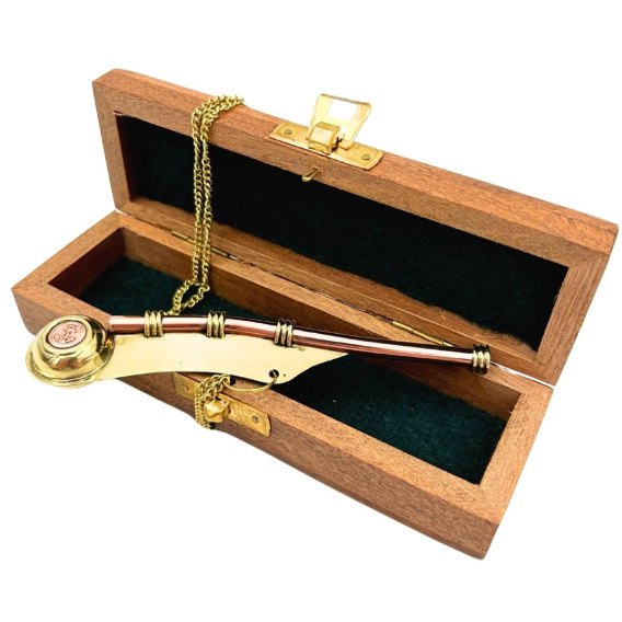 Gwizdek bosmański w pudełku drewnianym - idealny upominek dla miłośników morza, żeglarzy, kolekcjonerów i pasjonatów retro. Wykonany z mosiądzu z dbałością o detale, umieszczony w eleganckim drewnianym pudełku z mosiężnymi zdobieniami.