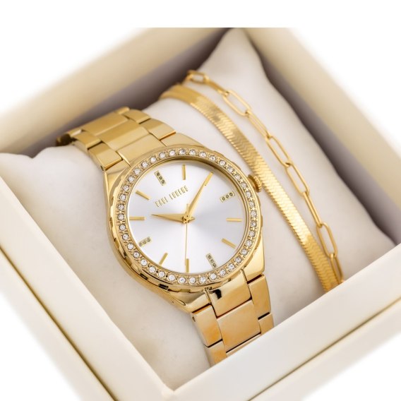 Komplet prezentowy damski, który zachwyca swoją elegancją i ponadczasowym stylem. Zawiera zegarek ze stali szlachetnej marki Paul Lorens w kolorze złotym, z piękną tarczą w kolorze srebrnym, która subtelnie podkreśla jego klasyczny charakter. Złota koperta zegarka, ozdobiona błyszczącymi cyrkoniami, dodaje całości wyjątkowego blasku. Zegarek charakteryzuje się także wodoszczelnością WR30, co sprawia, że jest praktyczny i funkcjonalny. Do kompletu dołączona jest podwójna bransoletka w kolorze złotym, która perfekcyjnie komponuje się z zegarkiem. To idealny wybór na prezent - elegancki, piękny i niezapomniany.