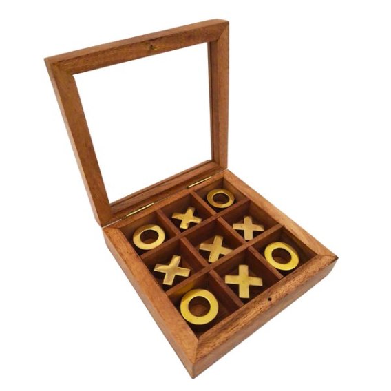 Kółko i krzyżyk w pudełku to elegancka wersja klasycznej gry strategicznej z ostatnich stron zeszytów. Klocki wykonane z drewna z mosiężnymi zdobieniami. Drewniane pudełko z przegródkami na kółka i krzyżyki jest jednocześnie planszą gry. Top pudełka jest szklany.