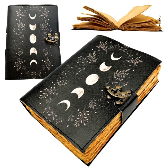 Okładka wykonana z naturalnej skóry koziej została ozdobiona złotym motywem faz księżyca, otoczonym dekoracyjnymi ornamentami przypominającymi gwiezdne konstelacje. Całość zamykana jest ozdobnym metalowym zapięciem w stylu antycznym, które podkreśla charakter starej księgi.