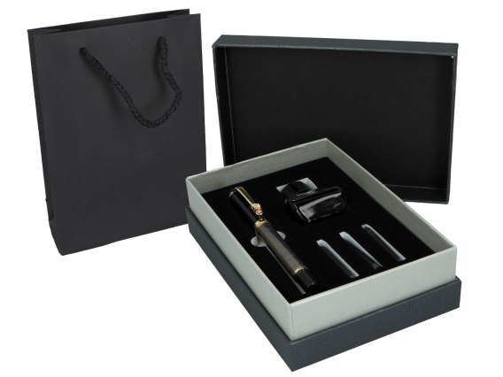 Pióro wieczne w ozdobnym etui, złote + atrament i naboje.