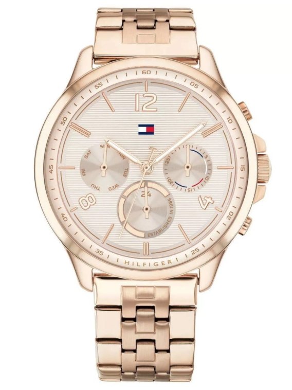 Zegarek damski Tommy Hilfiger Harper 1782224 to stylowa propozycja na co dzień, wyróżniająca się elegancką kolorystyką w odcieniach różowego złota. Koperta i bransoleta, wykonane z wysokiej jakości stali szlachetnej, świetnie komponują się z subtelną tarczą także w kolorze różowego złota, chronioną szkłem mineralnym. Tarcza wyposażona jest w funkcje datownika Day Date oraz wskaźnik czasu dobowego. Zegarek zasilany jest precyzyjnym mechanizmem kwarcowym, a jego wodoszczelność zapewnia ochronę przed drobnymi zachlapaniami.