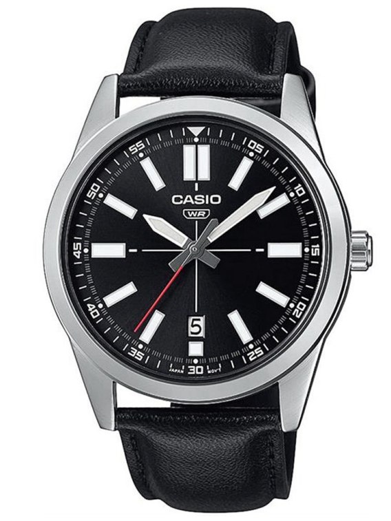 Zegarek męski Casio MTP-VD02L-1EUDF to elegancki model, który łączy klasyczny design z funkcjonalnością. Posiada czarny skórzany pasek, który doskonale komponuje się z czarną kopertą, nadając zegarkowi stonowanego, a zarazem nowoczesnego charakteru. Czarna tarcza z subtelnymi indeksami zapewnia świetną czytelność, a wbudowany datownik ułatwia śledzenie dnia miesiąca. Zegarek jest napędzany precyzyjnym mechanizmem kwarcowym, który gwarantuje dokładność pomiaru czasu. Chroniony szkłem mineralnym, które wykazuje odporność na zarysowania, zegarek zachowa swój elegancki wygląd przez długi czas. To doskonały wybór dla mężczyzn szukających funkcjonalnego, ale zarazem stylowego dodatku do codziennych stylizacji.