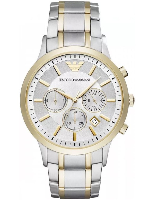 Męski zegarek Emporio Armani Renato AR11076 to klasyczny męski zegarek, idealny zarówno do eleganckiego ubioru, jak i do noszenia na co dzień. Koperta oraz bransoleta zostały wykonana ze stali szlachetnej, co gwarantuje jej wieloletnią odporność na zniszczenie. Na srebrnej tarczy zabezpieczonej mineralnym szkłem znajdziemy wyznaczniki godzin w kolorze złotym, datownik wskazujący dzień miesiąca oraz subtarcze będące wskazaniami chronografu.