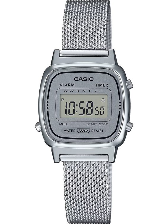 Zegarek damski Casio Retro Vintage LA670WEM-7DF to prawdziwa podróż w czasie - elegancki powrót do lat 80, kiedy styl i funkcjonalność szły ze sobą w parze. Ten model to połączenie retro designu z nowoczesną jakością, które sprawia, że każda kobieta poczuje się jak ikona mody z minionej epoki. Jego srebrna koperta i bransoleta o finezyjnym, ażurowym wzorze przywodzą na myśl klasyczne modele, które podbijały serca miłośników zegarków dekady temu. Prostokątna, szara tarcza z wyświetlaczem dodaje mu ponadczasowego charakteru, a czarny akcent na tarczy wprowadza odrobinę energii.